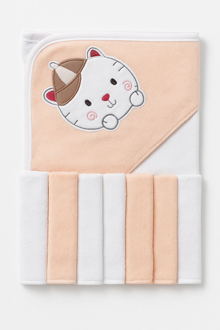 Baby 7Pcs Towel & Face Towels Set Kitty Peach & White - Mini Charm