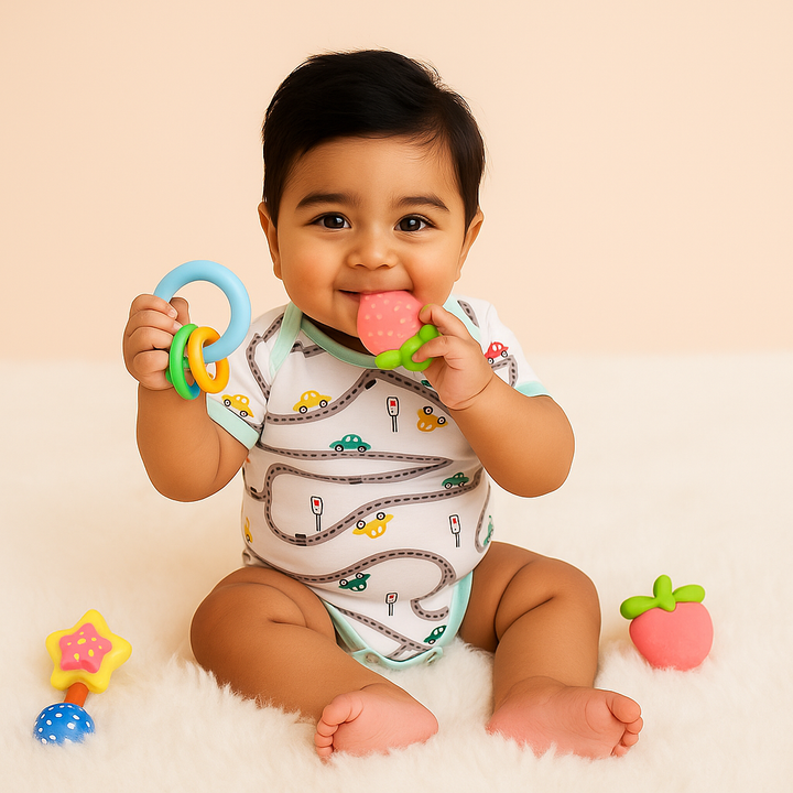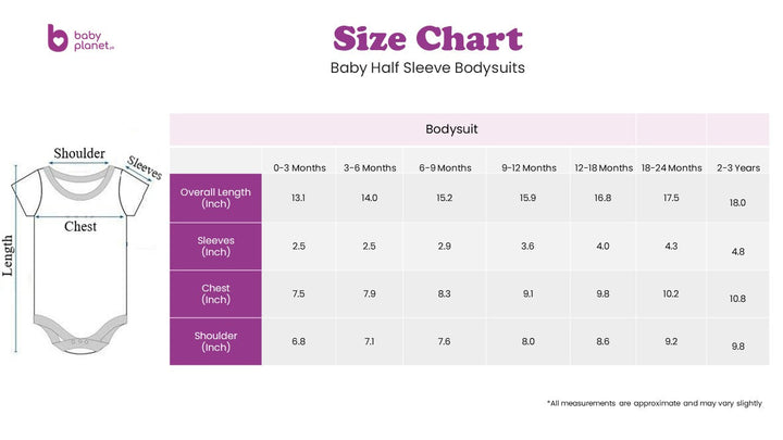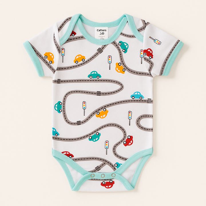 1 x Pc, 0 Months to 06 Months. Half Sleeve Baby Bodysuit in 'Sea Green & White' Color with 'All-over Car Print' - a comfy easy going one-piece cotton suits that feature a double ribbed round neckline, crotch snap button closure, and a half sleeve design, ideal for your baby to move around freely during playtime or relaxation.