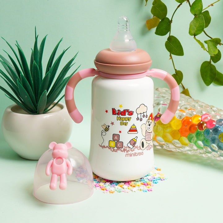 Pink Bear Feeding Bottle 270ml is a feeding bottle built for easy feeds at home or away. Package includes: 1 × Bottle, 1 × Soft Silicone Nipple, and 1 × Protective Cap. Made from BPA-free polypropylene and a soft teat, the vented design supports steady flow with a cute bear print; clear measurements up to 270 ml/9 oz, a leak-resistant cap, dishwasher/sterilizer safe, and an easy-grip shape simplify daily use It’s thoughtfully balanced for comfort, quick cleaning, and reliable use.
