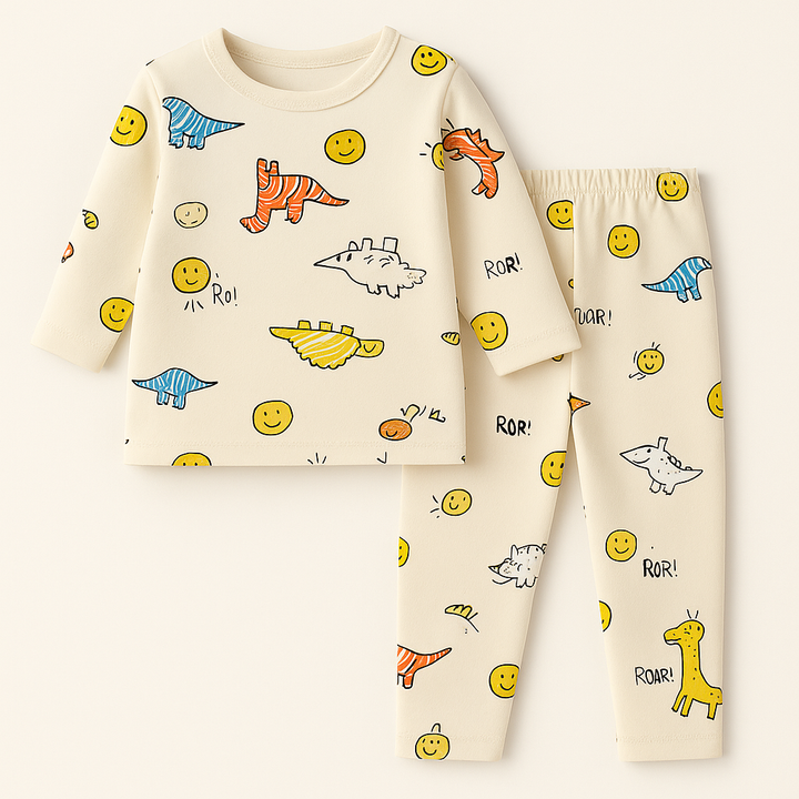 - Color & Print: Off white base with dino print.