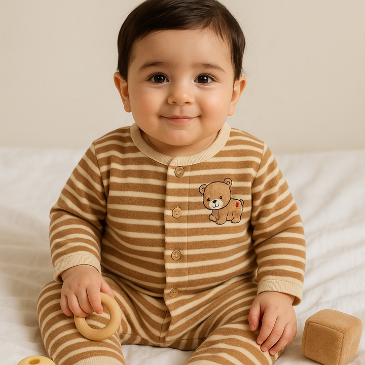 Baby Fleece Sleepsuit Stripes Bear Brown - Sunshine