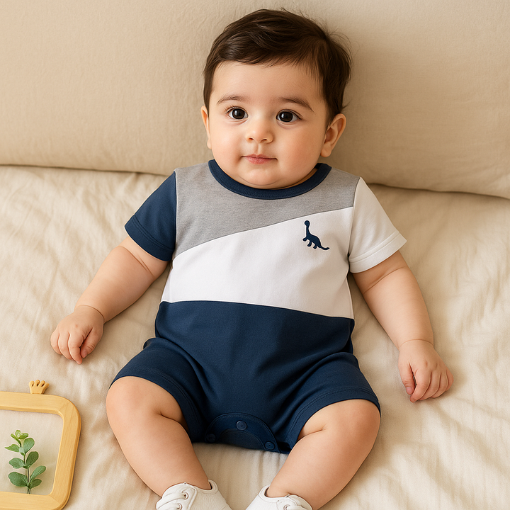 Baby Short-Body Cotton Romper Dino White & Navy Blue WC - Mini Charm