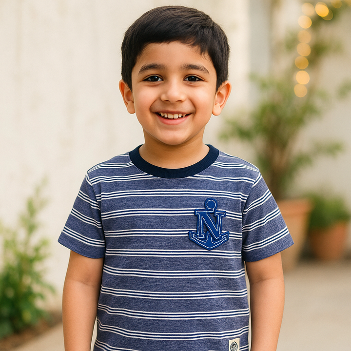 Kids Cotton T-Shirt Anchor Stripes Navy Blue - Mini Champ