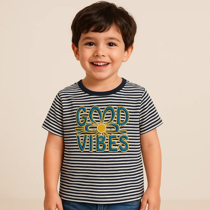 Kids Half-Sleeves T-Shirt Good Vibes Stripes Navy Blue - Mini Charm