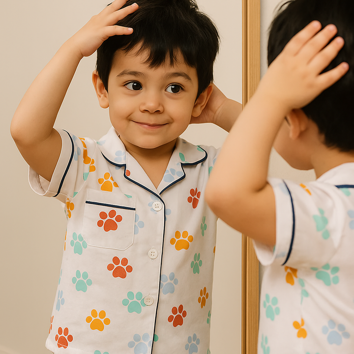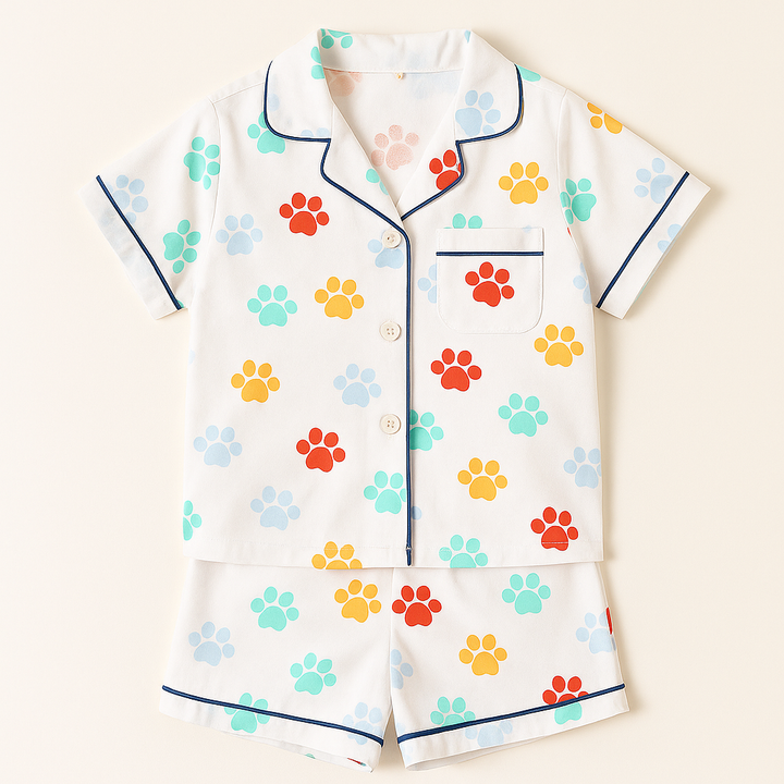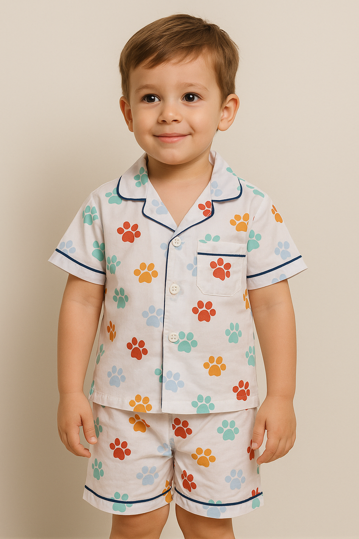 Kids Night Suit With Shorts Paws White - Mini Charm